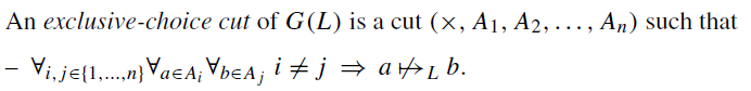 이를 정의로 나타내면 다음과 같다. 즉, 각 partition (A1, A2, ...)에 대해서 connection이 아예 없는 partition들은 서로 Exclusive-Choice cut 관계이다.