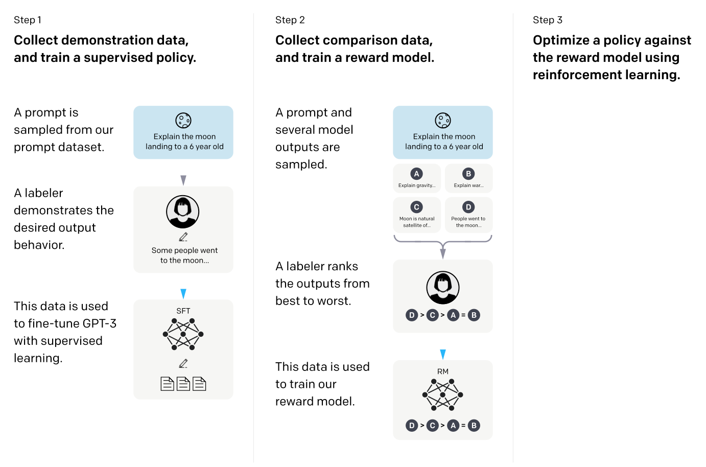 그렇다면 사람은 이러한 것이 잘못되었다 혹은 다른 것이 더 좋다, 신뢰할 수 있다고 판단할 수 있는 능력을 갖추었으니, 이러한 사람의 생각을 모델이 따르도록 학습하면 저런 말도 안 되는 글이 생성되는 것을 막을 수 있지 않을까? 이러한 아이디어에서 출발한 연구가 바로 RLHF이다.