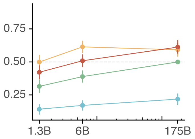이러한 RLHF는 LLM의 성능 향상에 큰 기여를 했다. 아래 그림에서 노란색과 빨간색이 RLHF를 적용한 것, 초록색이 SFT만 한 것, 그리고 파란색은 그냥 GPT인데 RLHF가 SFT보다 훨씬 성능이 높은 것을 확인할 수 있다.
