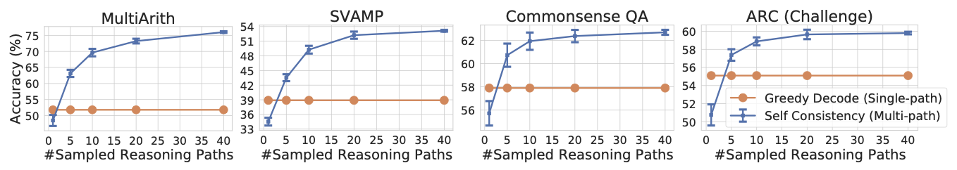 그렇다면 self-consistency가 다양한 reasoning trace를 생성하는 것을 통해 성능을 향상시키는데, 얼마나 다양한 샘플들을 생성해야할까? 이에 대한 대답은 아래 차트에서 알 수 있다. 보통 10개 정도의 샘플로도 큰 향상을 얻었고, 20-30개 이상 정도에서는 수렴하는 것을 확인할 수 있다.