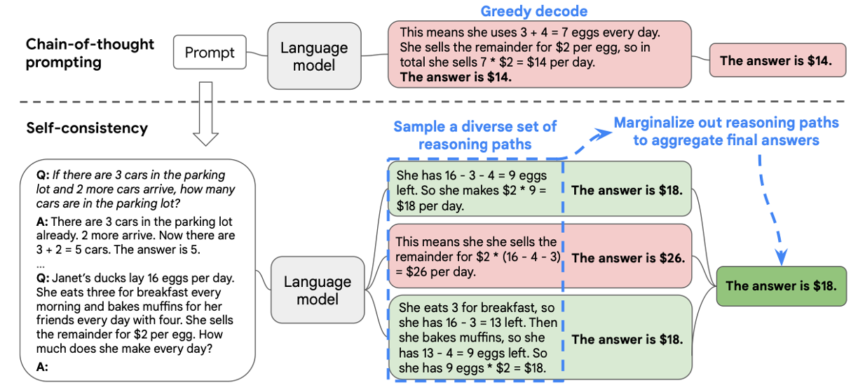 하지만 self-consistency 방법은 (그림에서 아래) 다양한 reasoning path들을 생성한다. 그림에서는 총 3개의 reasoning path를 생성했다. 이 때, 초록색으로 표현된 두 개의 reasoning path는 18이라는 같은 답을, 빨간색으로 표현된 한 개의 reasoning path는 26이라는 답을 도출했다. 이에 대해 majority voting 방식을 통해 reasoning path들을 marginalize하여 가장 높은 빈도로 도출된 답인 18을 최종 답으로 제시하는 것이다. 이 때, 다양한 reasoning path를 샘플링하는 데에는 temperature sampling, top-k sampling, nucleus sampling 등 어떠한 샘플링 방법도 모두 활용될 수 있다.