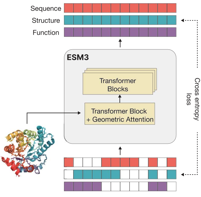 기존 ESMFold는 masked language modeling (MLM)을 활용해서 학습을 진행해왔다. 하지만 이러한 학습 방식은 단백질이 아미노산 하나씩을 채우는 방식으로 evolve하지 않고, 구조적 기능적으로 아미노산 시퀀스를 종합적으로 고려하여 3차원 구조로 folding하는 방식으로 evolve하기 때문에 실제로 어떻게 작동하는지와는 거리가 있다. 이에 ESM-3는 시퀀스, 구조, 기능을 모두 jointly modeling하여 단백질의 특성을 좀 더 현실적으로 고려할 수 있는 학습 방식을 제시하였다.