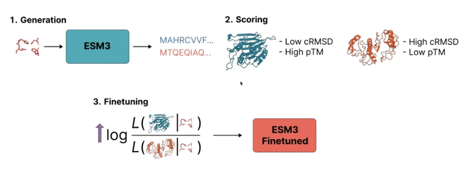 마지막으로, ESM-3는 MLM pre-training 이후에 단백질이 evolve하는 과정과 비슷한 training objective를 가지는 alignment-based fine-tuning 과정을 거친다. 이는 RLHF와 약간 비슷하게, 각 protein pair를 비교하여 더 높은 점수를 가지는 단백질을 priortize하도록 진행된다. 이 때, 이 점수는 원하는 property (cRMSD, pTM 등)로 다양하게 결정될 수 있다. 이렇게 더 높은 점수를 가지는 단백질의 likelihoood를 높이는 방식으로 학습을 진행함으로써 모델이 function에 대한 고려까지 할 수 있게 한다.