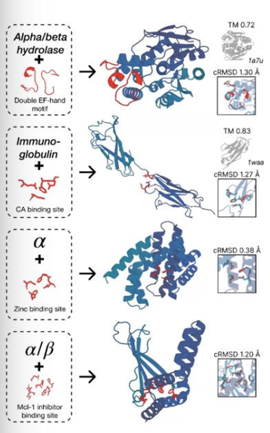 이는 두 개 이상의 modality를 condition으로 주는 것으로 확장할 수도 있다. 예를 들어, 아래 그림에서는 structural fold와 functional site의 두 개의 모달리티를 조건으로 하는 multi-objective 단백질 structure를 예측하도록 하였는데, 이것 또한 조건에 잘 부합하도록 생성하는 것이 가능하다는 것을 확인할 수 있다.