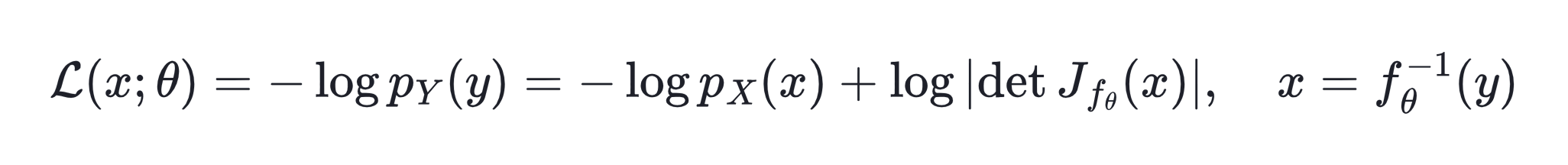 그럼 결국 normalzing flow의 목표는 분포 사이의 transformation을 잘 해주는 적절한 $f_\theta$를 찾는 것이다. 이 때, 이 f는 1) 항상 역함수를 구할 수 있는 invertible한 함수이고, 2) determinant를 구하기 쉬운 형태로 정의된다. 이 적절한 f를 찾기 위해서는 적절한 objective를 가지고 학습을 진행해야 한다. 이 때 적절한 objective로는 다른 ML 알고리즘들처럼 data point x의 negative log-likelihood를 최소화하는 것이 사용된다. 이를 식으로 표현하면 다음과 같다.