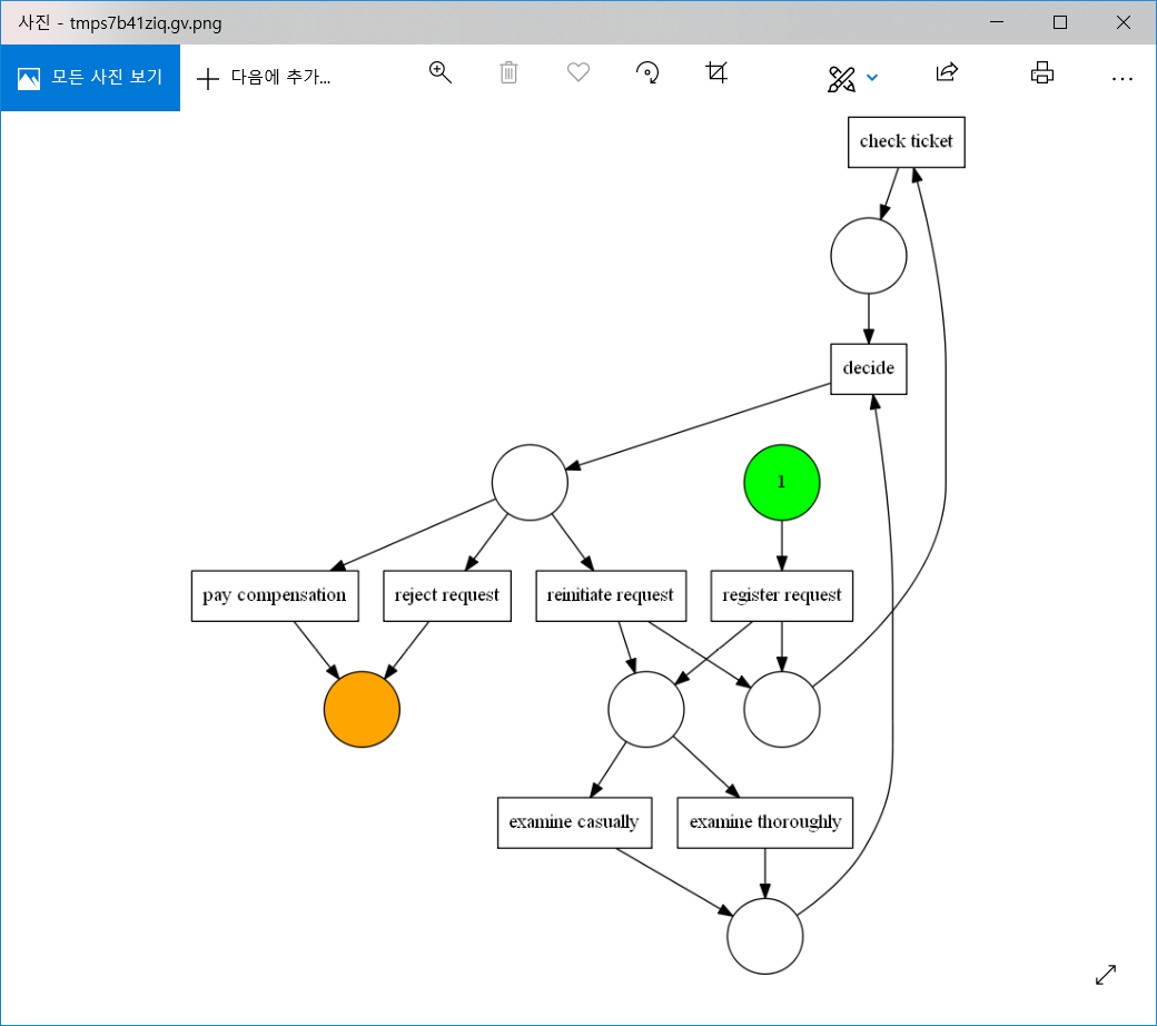 pm4py를 통해 코드 몇 줄로 간단하게 event log로부터 알파 알고리즘으로 프로세스 모델을 도출할 수 있다.