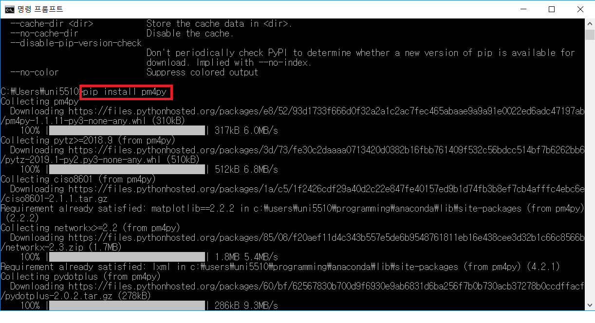 4-2. cmd (명령 프롬프트) 창 혹은 Powershell을 켜고 pip install pm4py를 입력해주고, 설치가 끝날 때까지 기다린다.