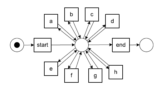 이 모델은 모든 trace들을 일렬로 쭉 표현한 모델이다. 이벤트 로그에 나타난 trace 외에 다른 trace는 전혀 설명할 수가 없다. 즉, generalization이 낮은 overfitted model인 것이다.