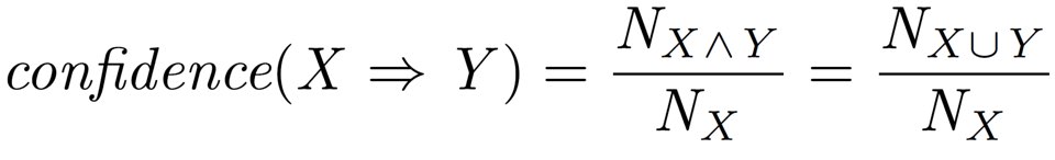 위 식에서 N_x는 x가 나온 경우의 수, N_x^y는 x와 y가 동시에 일어난 경우의 수를 의미한다. 위에서 든 예시와 똑같이 , 우리가 차와 라떼를 주문한 고객이 머핀을 주문할 confidence 값을 구하고 싶다고 하자. 그러면 우리는 다음과 같은 식을 통해 confidence를 계산할 수 있다.