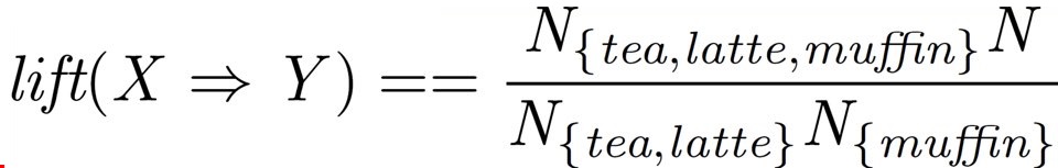 또 다시 우리가 차와 라떼를 주문한 고객이 머핀을 주문할 lift 값을 구하고 싶다고 하자. 그러면 우리는 다음과 같은 식을 통해 lift를 계산할 수 있다.