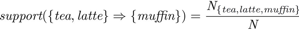 위 식에서 N은 전체 경우의 수, N_x^y는 x와 y가 동시에 일어난 경우의 수를 의미한다. 예를 들어, 우리가 차와 라떼를 주문한 고객이 머핀을 주문할 support 값을 구하고 싶다고 하자. 그러면 우리는 다음과 같은 식을 통해 support를 계산할 수 있다. 즉, 차, 라떼, 머핀을 동시에 구매한 경우의 수를 전체 경우의 수로 나눈 값이 support가 된다.