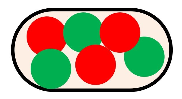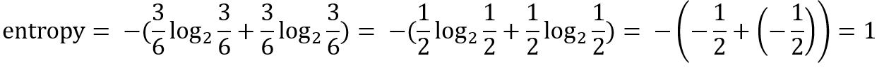 이 노드에는 전체 6개의 원 중 3개는 빨간색, 3개는 초록색으로 이루어져 있다. 이 노드의 entropy를 계산하면 다음과 같다.