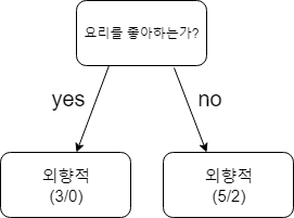 우리의 예시에서는 독립 변수가 두 개 있다. 먼저, 요리를 좋아하는가?에 따른 entropy를 계산해보자. 우선, 요리를 좋아하는가에 따라 decision tree를 만들면 다음과 같은 형태가 된다.