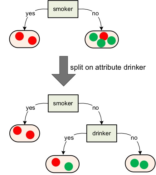이런 식으로 나눠진 각 subset (terminal node)의 복잡성이 가장 낮은 방향으로, 즉 가장 덜 섞인 방향으로 decision tree를 발전시켜 나가는 것이 decision tree의 목적이다.