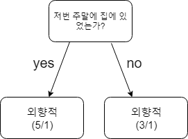 다음으로, 저번 주말에 집에 있었는가? 에 따른 entropy를 계산해보자. 우선, 저번 주말에 집에 있었는가에 따라 decision tree를 만들면 다음과 같은 형태가 된다.