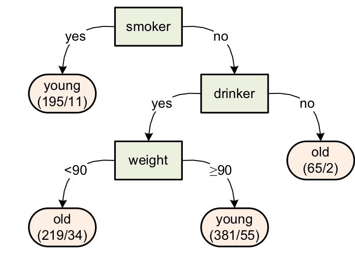 이 decision tree는 나이를 예측하는 decision tree이다. 그림을 해석하면 다음과 같다. 담배를 피는 사람 (smoker - yes)이라면 나이가 어리다. 왜냐하면, 담배를 피는 사람 (smoker - yes) 195명 중에서 184명이 young이고 11명만이 old이기 때문이다. 담배를 피지 않는 사람 (smoker - no) 중에서 술을 마시지 않는 사람 (drinker - no)은 나이가 많다. 왜냐하면, 담배를 피지 않고 술을 마시지 않는 사람 65명 중에서 2명만이 young이고 63명이 old이기 때문이다.