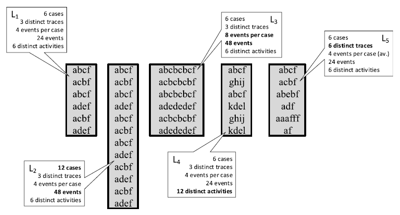 위 척도들을 이벤트 로그에 대해 계산하여 나타낸 행렬을 event log metrics라고 한다. 예를 들어, 다음과 같은 다섯 개의 이벤트 로그가 있다고 하자.