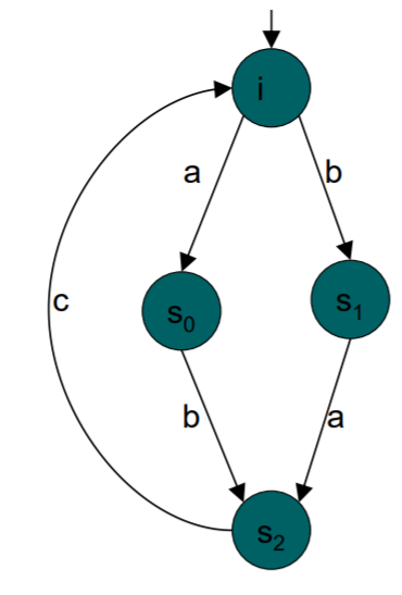 우선, 이벤트 a의 pre-region은 r1이다. 그리고 r1에 속해 있는 state는 i, s1인데 이들은 모두 a를 enable한다. 그러므로 a에 대해서 이 성질을 만족한다. 다음 예시로 c를 살펴 보자. c의 pre-region은 r2, r4이고 이의 교집합은 s2이다. s2는 c를 enable하므로 c에 대해 이 성질을 만족한다.