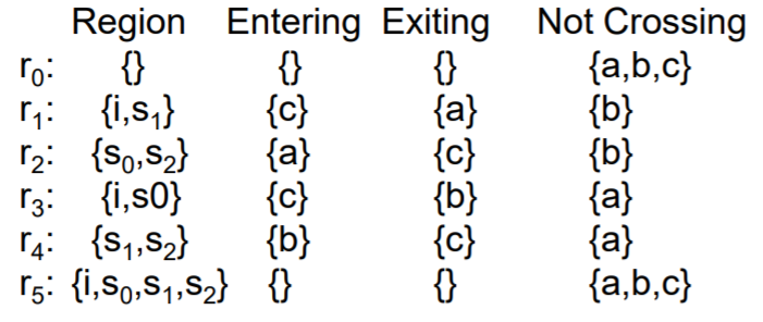그리고 Transition system의 region을 모두 구하면 다음과 같다. (region이 무엇인지 궁금하다면 위의 state based region theory 관련 포스팅을 참고하도록 한다.)