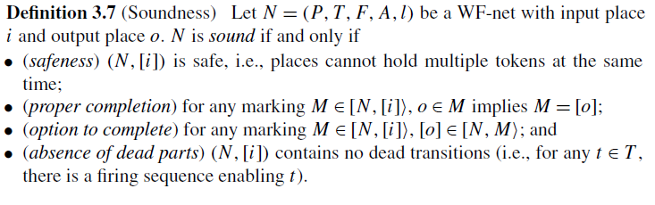 Workflow net의 soundness는 다음과 같이 정의할 수 있다.