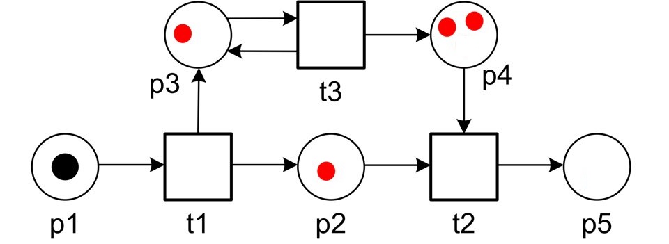 그렇다면, 위의 예시 petri net은 proper completion을 만족할까? 답은 아니다. 바로 위의 marking 상황에서 t2가 fire되면 sink place인 p5에 marking이 생기는데, 아직 p3와 p4에 token이 남아 있기 때문이다.