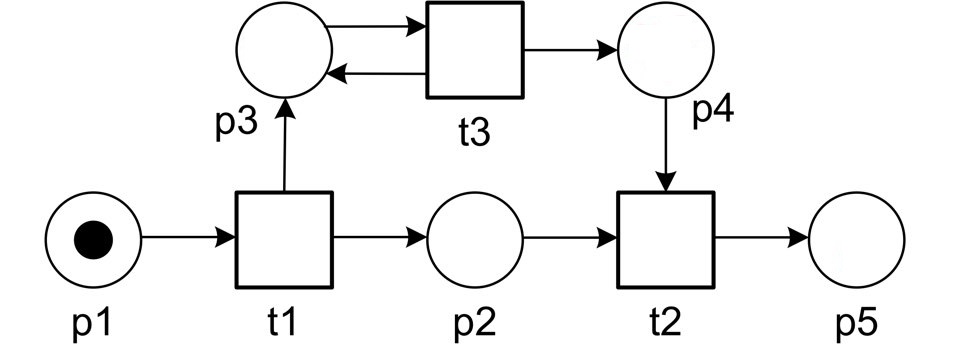 이 페트리 넷은 absence of dead parts 조건을 만족하는가? 답은 아니다. 왜냐하면 t3 트랜지션은 절대로 enable될 수 없기 때문이다. 즉, t3는 dead transition이다.