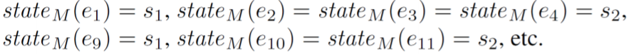 즉, 프로세스 모델(transition system)에서 이벤트 e가 일어나기 직전의 state를 말한다. 예를 들어, 우리의 이벤트 e2는 abce trace 내에서 b이고, 이 b가 일어나기 직전 state는 s2가 된다. 좀 더 예시를 들면 다음과 같다.