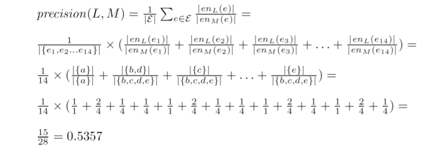 위 과정에 따라 각 이벤트에 대한 en_M과 en_L을 모두 구했다면 이제 precision을 계산할 차례이다. precision은 다음과 같은 계산식으로 계산할 수 있다.