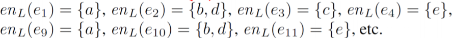 즉, 이벤트 e의 context_L (2에서 구함)이 같은 액티비티들을 말한다. 예를 들어, abcd 안의 두 번째 이벤트 b에 해당하는 e2의 context_L은 <a>이다. 또 context_L이 <a>인 이벤트에는 e6, e10, e13이 있다. e6은 e2와 같이 b이고, e10, e13은 d이기 때문에 e2의 en_L은 {b,d}가 된다. 좀 더 예시를 들면 다음과 같다.