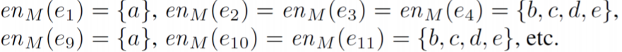 즉, 이벤트 e의 state_M (3에서 구함)에서 enable되는 모든 액티비티의 집합을 말한다. 예를 들어, en_M(e2)는 state_M(e2)가 s2이기 때문에 s2에서 enable되는 {b,c,d,e}가 될 것이다. 좀 더 예시를 들면 다음과 같다.