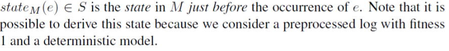 즉, 프로세스 모델(transition system)에서 이벤트 e가 일어나기 직전의 state를 말한다. 예를 들어, 우리의 이벤트 e2는 abce trace 내에서 b이고, 이 b가 일어나기 직전 state는 s2가 된다. 좀 더 예시를 들면 다음과 같다.