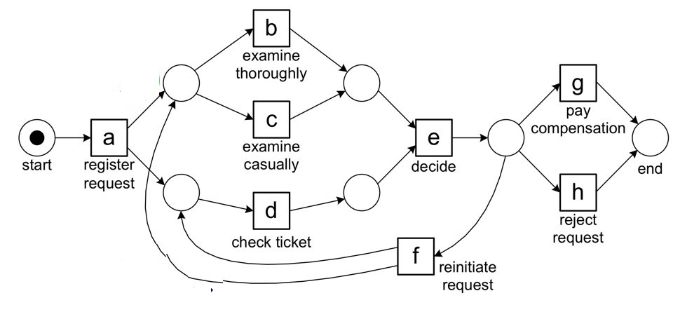 우리는 위 프로세스 모델로부터 <a, b, d, e, g>, <a, c, d, e, g> 등 다양한 trace를 만들어낼 수 있을 것이다. 이렇게 모델로부터 만들어낸 trace들과 이벤트 로그로부터 얻어낸 trace를 이용하여 다양한 alignment를 만들어낼 수 있다.