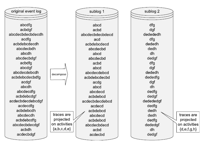 이 때, 케이스를 분류하는 기준은 케이스의 액티비티의 개수, 케이스의 소요 시간 등 다양한 기준이 될 수 있다. 이러한 decomposition에 따라데이터의 크기가 줄어들게 되고, 이들을 parallel하게 연산함으로써 더 빠른 연산이 가능해진다. 하지만 inductive miner나 region-based process discovery와 같은 알고리즘에는 case-based decomposition이 사용될 수 없다. 또한 Conformance Checking의 complexity는 대부분 액티비티의 개수나 trace의 길이에 의해 결정되기 때문에 parallel한 연산으로 연산 시간을 줄이는 것에는 한계가 있다. 그래서 등장한 것이 activity-based decomposition이다.