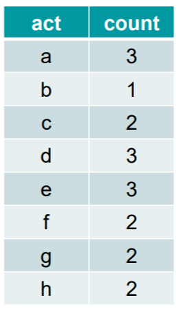모든 액티비티에 대해 각 subnet들에 몇 번씩 나타났는지를 모두 조사한다. 우리의 예시에서의 각 액티비티의 빈도는 다음과 같다.