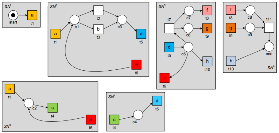 예를 들어, 첫 번째 subnet(SN1)에는 a 액티비티만 포함되므로 <a>, 두 번째 subnet(SN2)에는 a, b, d, e 액티비티가 포함되므로 <a,b,d,e,d>, 세 번째 subnet(SN3)에는 a,c,e 액티비티가 포함되므로 <a,e,c>, 네 번째 subnet(SN4)에는 c,d 액티비티가 포함되므로 <d,c,d>, SN5에는 d,e,f,g,h 액티비티가 포함되므로 <d,e,d,g,f,h>, SN6에는 f,g,h 액티비티가 포함되므로 <g,f,h>로 trace가 나누어진다.