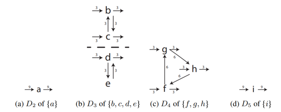 우리는 우리의 예시로부터 세 개의 sequential cut을 찾을 수 있다. 여기에서 기존의 Inductive Miner와 다른 부분이 나온다. 기존의 Inductive Miner는 cut이 찾아지면 이에 따라 이벤트 로그를 다시 돌아가면서 하나하나를 projection하는 방식으로 DFG를 만들어 주었다. 하지만 IMD에서는, 이벤트 로그를 다시 하나하나 돌아가는 것이 아니라 DFG 자체를 cut에 따라 바로 나누어 준다. 데이터가 크면 클수록 이벤트 로그를 하나하나 다시 돌아가며 projection하는 것이 부담스러워지겠지만, IMd의 경우 맨 처음에 DFG를 찾을 때만 이벤트 로그를 참고하기 때문에 빅 데이터에 대해 process discovery를 하는 것이 가능해지는 것이다.