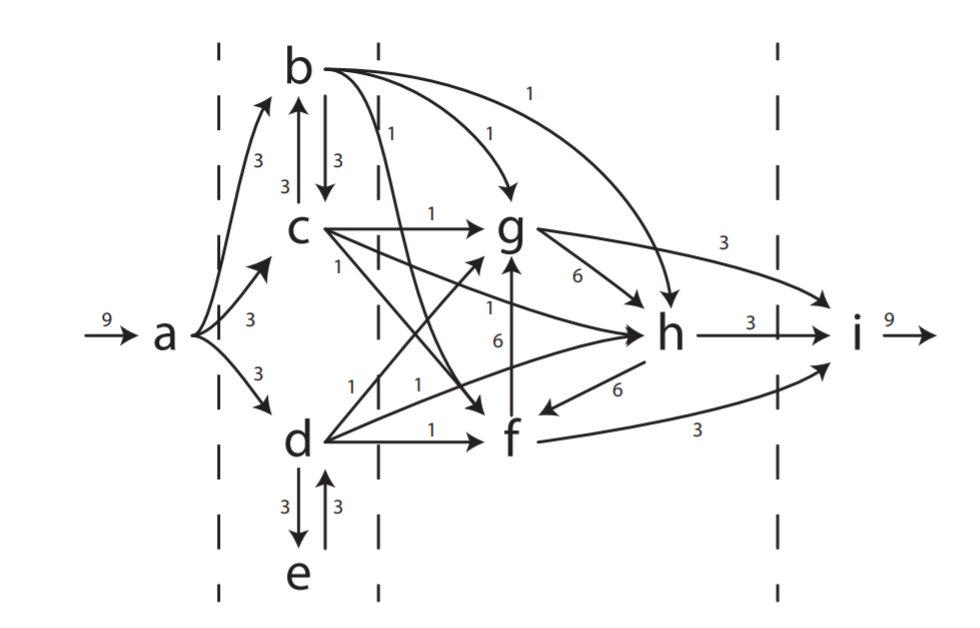 가장 먼저 해야 할 일은 보통의 Inductive Miner와 같이 이벤트 로그로부터 Directly Follows Graph를 도출하고, 그 DFG에서 cut을 찾는 일이다. (자세한 것은 위의 Inductive MIner 포스팅을 참고한다.) 이렇게 DFG와 Cut을 찾으면 다음과 같다.