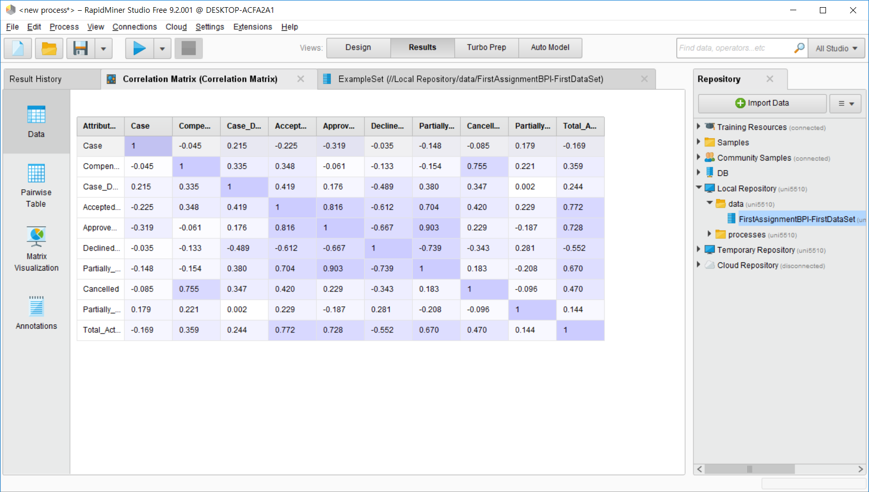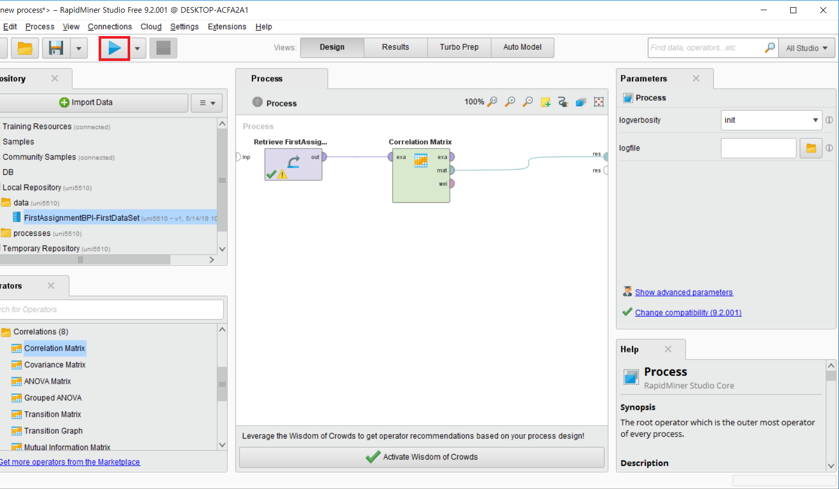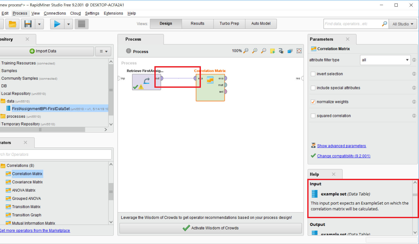 저 Help를 바탕으로 하여 각 operator를 연결할 때 맞는 타입끼리 연결해주면 된다. 이 예시의 경우에는, Correlation Matrix의 input이 example set (Data Table)이기 때문에 우리가 import 한 데이터를 input으로 연결해 주었다.