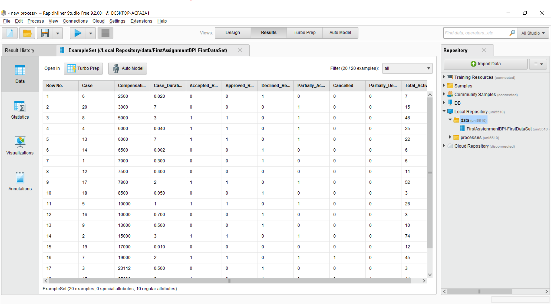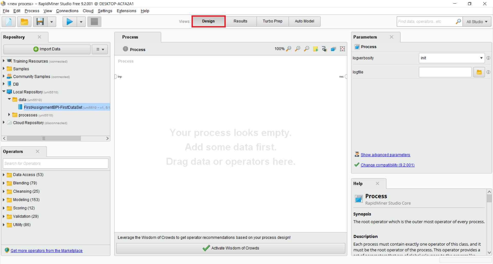 데이터를 분석하려면 무엇이 있어야 하는가? 데이터가 있어야 한다! (당연) 이를 위해서 RapidMiner에 데이터를 불러 오도록 하겠다. 나는 지금 수강하고 있는 Business Process Intelligence 과목의 과제 csv 파일을 이용할 것이다. 원하는 데이터 파일이 있다면 다른 것을 써도 무방하다.