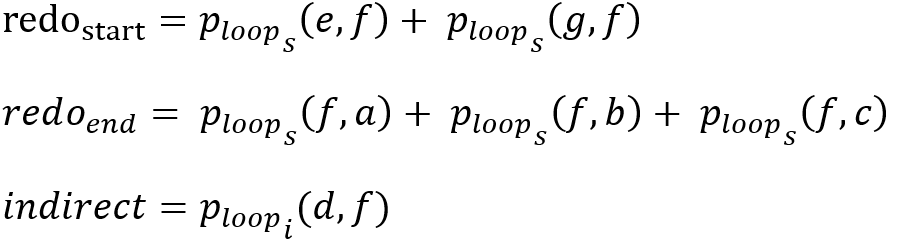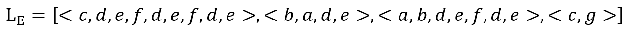 그리고 S_2와 E_2는 각각 loop body end activity 뒤에 오는 액티비티 집합, loop body start activity 앞에 오는 액티비티 집합을 말한다. 예를 들어, 우리의 이벤트 로그에서는 d, e, f로 이루어진 루프가 보이는 것 같은 패턴이 나타난다. 이들은 {d,e,f,d,e,f,d,e}, {d,e}, {d,e,f,d,e}로 구성되어 있으므로 loop body는 d,e, body가 아닌 부분은 f가 될 것이다. 그러므로 loop body end activity는 e, loop body start activity는 d가 된다. 그러므로 이벤트 로그에서 S_2는 loop body end activity인 e 뒤에 오는 액티비티인 f가 되고, E_2는 loop body start activity인 d 앞에 오는 액티비티인 f가 된다. 즉, 우리가 구한 것들을 정리해보면 다음과 같다.