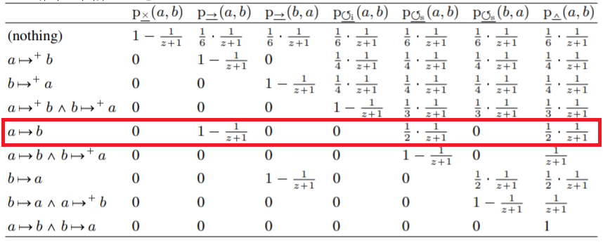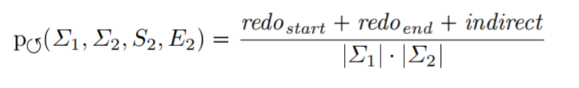 이 때, z를 구하는 식은 ( |a| + |b| ) / 2이고 우리의 이벤트 로그로부터 a와 b가 일어난 횟수를 각각 구하면 2, 2이기 때문에 z가 2가 된다. 그러므로 p->(a,b)는 1-1/3 = 2/3이 된다. 이런 식으로 모든 관계에 대해 확률을 구하고, 식에 대입해주면 우리가 원하는 {a,b,c}, {d,e,f,g}가 sequence cut일 확률을 구할 수 있다. (모든 계산은 생략한다.)