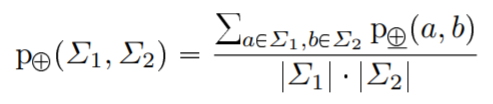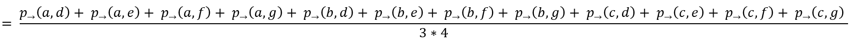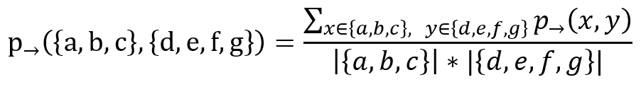예를 들어, 우리가 위에서 보았던 예시 이벤트 로그에서, {a,b,c}, {d,e,f,g}가 sequence cut으로 나뉘는 확률을 구하고 싶다고 하자. 그러면 sigma1은 {a,b,c}, sigma2는 {d,e,f,g}, operator는 sequence가 될 것이다. 그러므로 우리는 다음과 같은 식을 계산하면 된다.