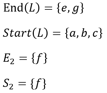 위 식에서 End(L)과 Start(L)은 각각 각 trace의 end activity, start activity를 의미한다. 그러므로 우리의 이벤트 로그에서 End(L)은 {e,g}, Start(L)은 {a,b,c}가 된다.