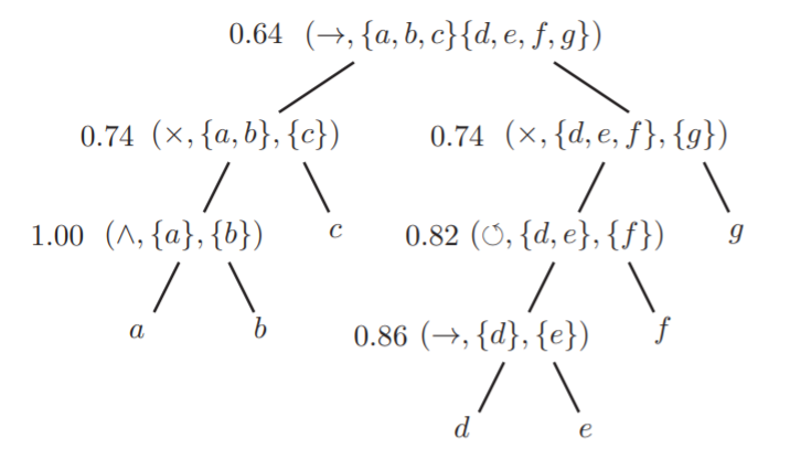 이런 식으로 각 액티비티 뭉치들에 대해서 XOR, Parallel, Sequence, Loop cut 확률을 모두 계산하여 가장 확률이 높은 Cut을 해당 trace의 Cut으로 정함으로써 process tree를 도출할 수 있다. 계산 과정을 모두 나열하면 글이 너무너무 길어질 것이기 때문에 결과를 보여주는 것으로 생략한다.