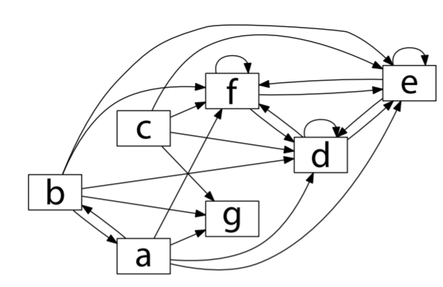 이 때, c로부터 d를 지나면 e로 도달할 수 있다. 이렇게 직접적으로 연결되지는 않았지만 결과적으로 도달할 수 있는 것까지 모두 그래프로 표현한 것을 transitive clsoure을 표현했다고 한다. 이를 그래프로 나타내면 다음과 같다.