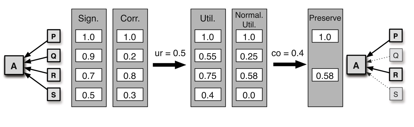 예를 들어, 다음과 같이 A에 연결된 P, Q, R, S 액티비티와 그 엣지들이 있다고 하자. 그리고 그들의 significance와 correlation 값은 다음과 같다.