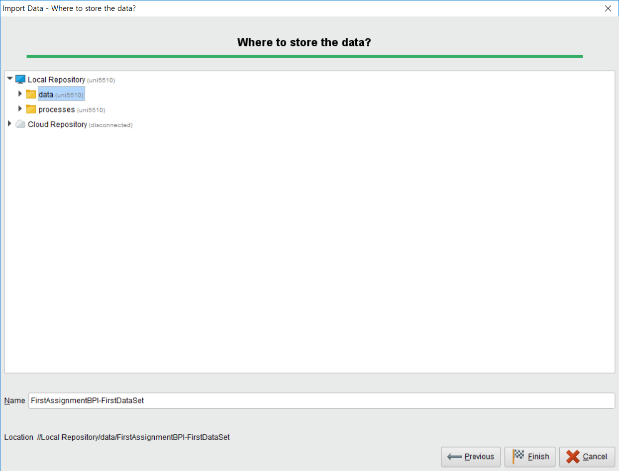 1-5. Where to store data? 가 나오면 data 폴더를 클릭하고 Finsih 버튼을 누른다. data 폴더에는 dataset들을, processes 폴더에는 뒤에 나올 workflow들을 저장하는 것을 기본으로 한다.