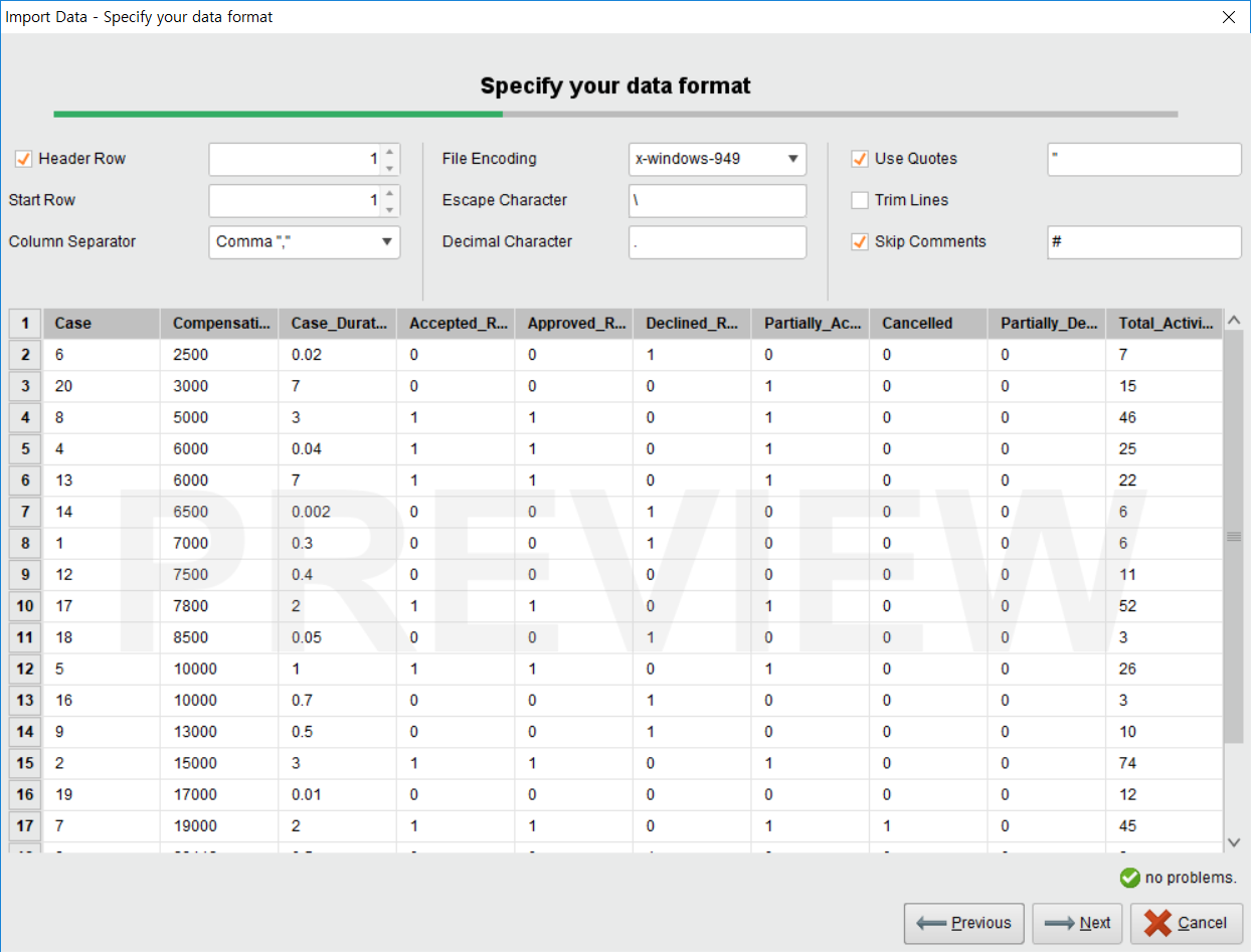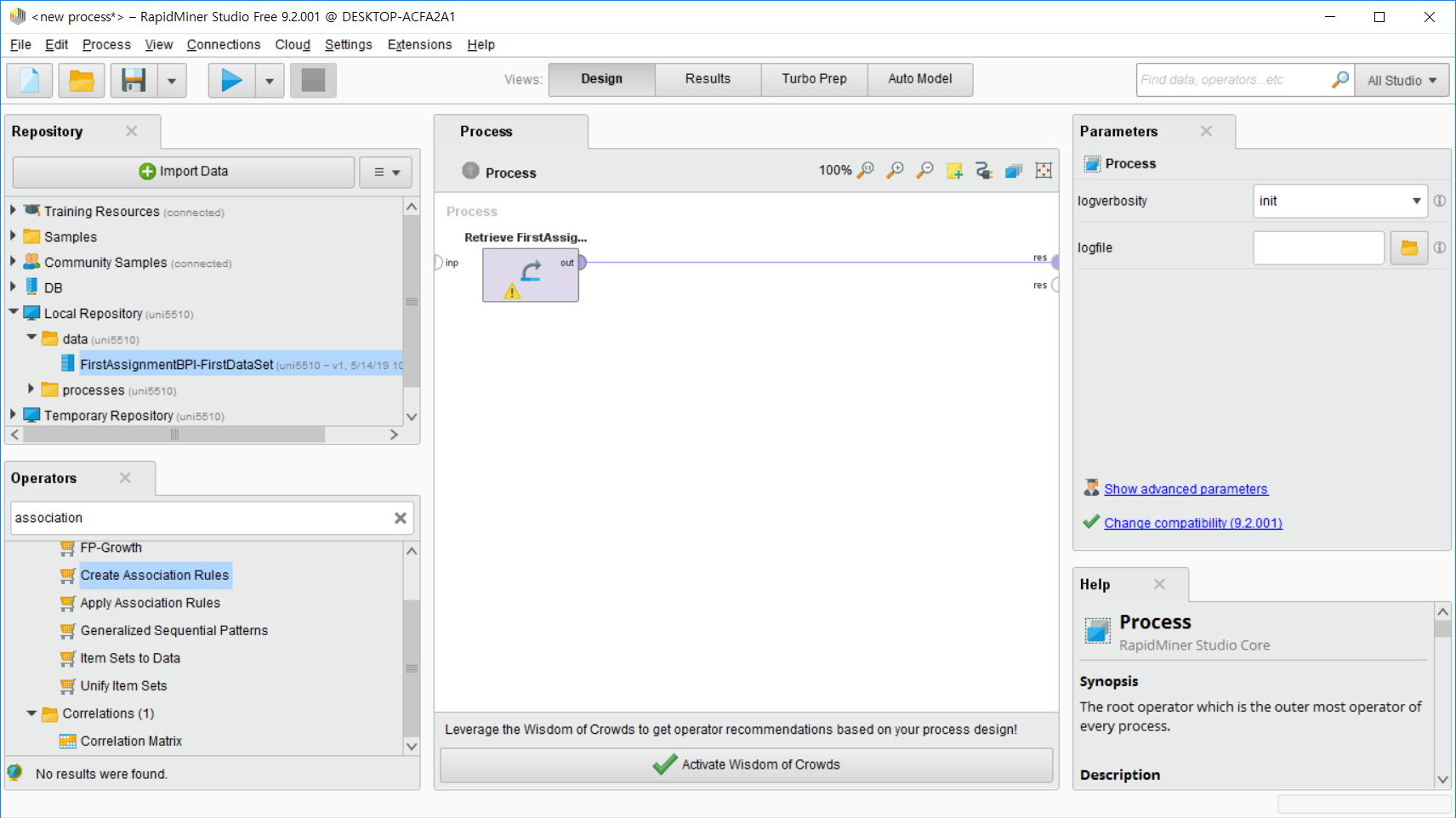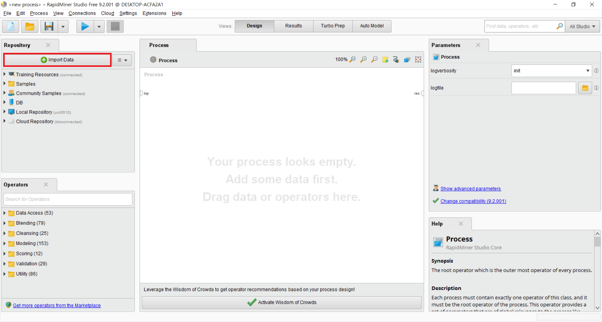 데이터를 분석하려면 무엇이 있어야 하는가? 데이터가 있어야 한다! (당연) 이를 위해서 RapidMiner에 데이터를 불러 오도록 하겠다. 나는 지금 수강하고 있는 Business Process Intelligence 과목의 과제 csv 파일을 이용할 것이다. 원하는 데이터 파일이 있다면 다른 것을 써도 무방하다.