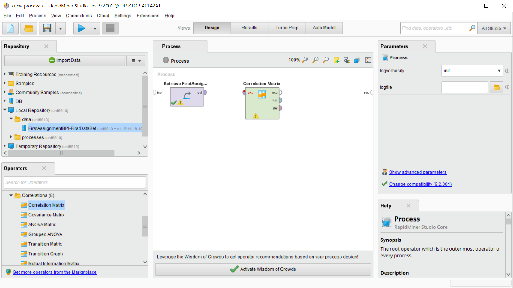 2-3. operators에서 원하는 분석 operator를 선택하여 드래그하여 process에 놓는다. 가장 간단한 예시를 위해 Correlation Matrix operator를 선택했다.