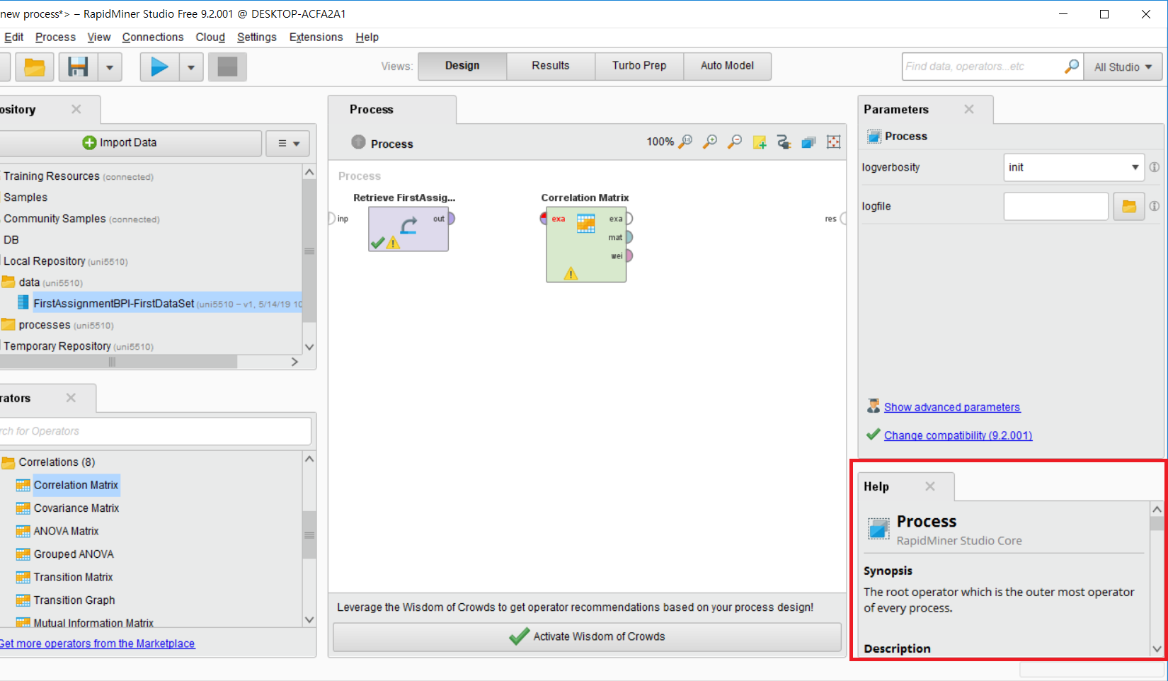 저 Help를 바탕으로 하여 각 operator를 연결할 때 맞는 타입끼리 연결해주면 된다. 이 예시의 경우에는, Correlation Matrix의 input이 example set (Data Table)이기 때문에 우리가 import 한 데이터를 input으로 연결해 주었다.